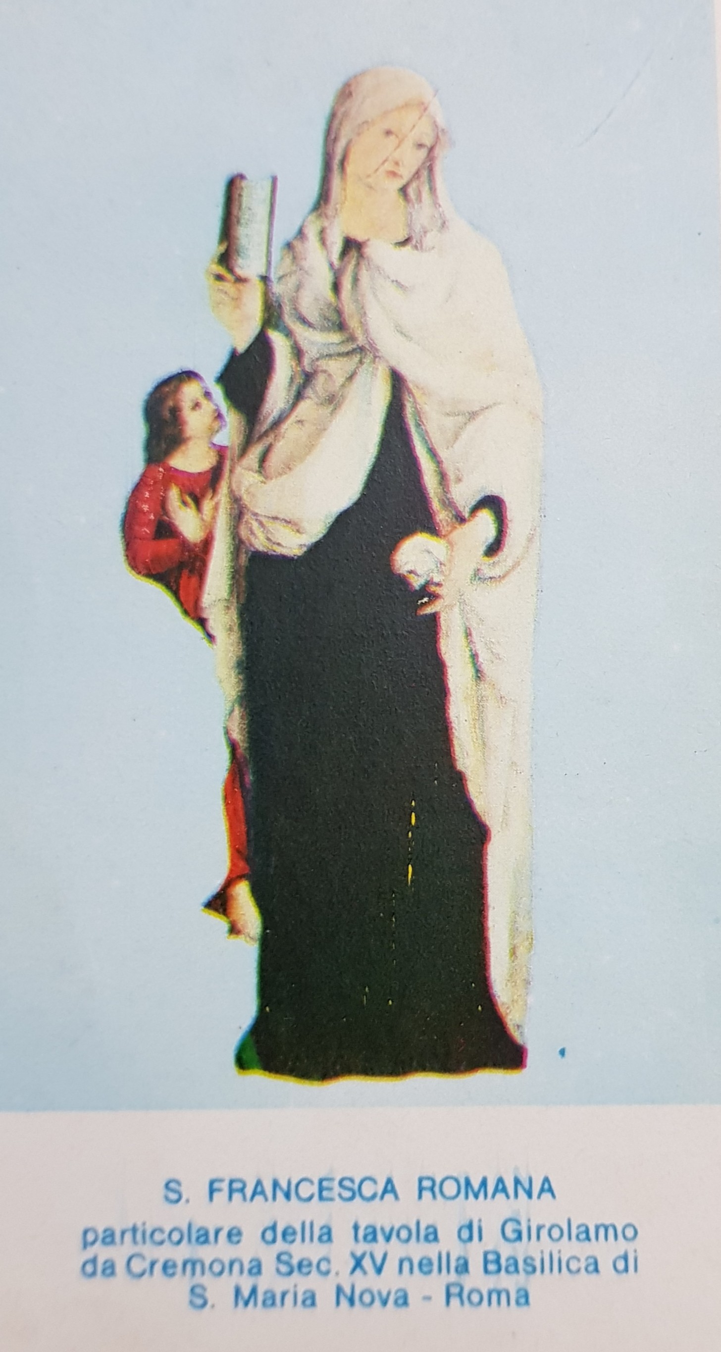 S. Francisca Romana, 1384-1440, foi esposa, mãe e viúva exemplar. Operou esplêndidos milagres em sua vida e após a morte. Oblata da Ordem dos Beneditinos de Monteoliveto e fundadora da Pia Casa di Tour de’ Specchi, teve a assistência visível de um Anjo. A sua proteção é salvaguarda e defesa de todos os perigos. É padroeira dos motoristas.