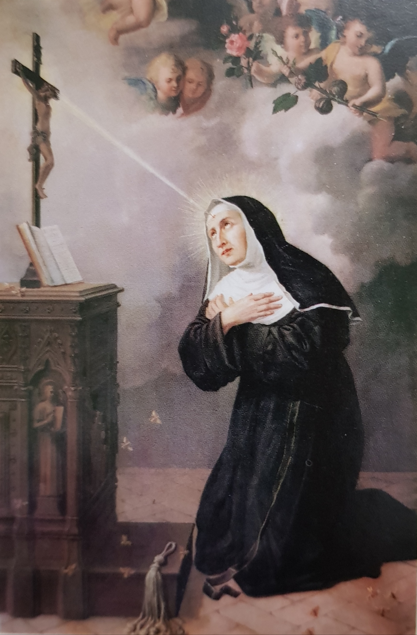 Santa Rita de Cássia – Viveu no século XV, na Úmbria, Itália. Tendo perdido o marido e os filhos, fez-se monja agostiniana no convento de Cássia. Estigmatizada. Tinha na fronte um ferimento que não sarava – como se fosse causado por um espinho da coroa de espinhos de Cristo. Evocada nos casos desesperados ou de solução impossível, devido ao seu milagre final. Ao morrer, pediu uma rosa, que miraculosamente florira fora de estação no seu jardim.